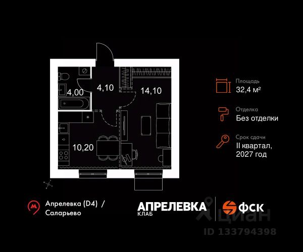 Прямая продажа от застройщика! Загородный жилой комплекс класса Комфорт Плюс. Продаётся 1-к квартира 108 общей площадью 32.4 кв.м на 2-м этаже 5 этажного дома. Без отделки. Расположение комплекса: "Апрелевка Клаб" это жилой комплекс всего в 30 км от Москвы по Киевскому шоссе, где городские удобства гармонично сочетаются с природой. Здесь начинается новая ступень жизни: современная малоэтажная застройка не нарушает живописные виды, а закрытая территория дарит чувство безопасности. Особенности проекта: - Улучшенная отделка МОПов - Социальная инфраструктура в шаговой доступности: муниципальные детский сад и школа, поликлиника - Не просто школа: школа МГИМО - Школа искусств МАРХИ - Всесезонное уникальное благоустройство: от города к природе через призму искусства - Комфортное пространство (спорт, досуг с детьми, работа в удаленном формате с прекрасными видами, место для творчества, тихие места для уединения и размышления) - Отличная транспортная доступность Транспортная доступность: - Метро Филатов Луг и Рассказовка 25 км - МЦД Апрелевка 5 км - МКАД — 30 км - Садовое кольцо — 45 км - Метро в Троицке (открытие в 2030) — 22 км - Ближайшая остановка общ. транспорта "Фрунзевец" 550 м - Ст. м. "Саларьево" 30 мин. на автобусе Внутренняя инфраструктура: Здесь есть хобби на любой вкус, возраст и сезон. Велосипедные, беговые и прогулочные маршруты, уличный workout, летний амфитеатр, спортивная площадка, центральная площадь с сухим фонтаном и игровыми зонами. Крытые развлечения: зона коворкинга, детская комната, кафе. В жилом комплексе будет современная школа на 830 мест и детский сад на 400 мест нового формата: с просторными классами и современным оснащением согласно высоким стандартам. Также на территории будет размещена школа искусств. Дворы без машин, игровые зоны и маршруты для прогулок с навигацией минимизируют риски и создают ощущение защищенности. Вдоль южной границы комплекса протекает река Десна, создавая зону отдыха в природном окружении.