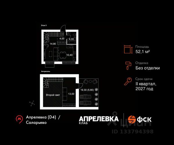 Прямая продажа от застройщика! Загородный жилой комплекс класса Комфорт Плюс. Продаётся 2-к квартира 129 общей площадью 52.1 кв.м на 5-м этаже 5 этажного дома. Без отделки. Расположение комплекса: "Апрелевка Клаб" это жилой комплекс всего в 30 км от Москвы по Киевскому шоссе, где городские удобства гармонично сочетаются с природой. Здесь начинается новая ступень жизни: современная малоэтажная застройка не нарушает живописные виды, а закрытая территория дарит чувство безопасности. Особенности проекта: - Улучшенная отделка МОПов - Социальная инфраструктура в шаговой доступности: муниципальные детский сад и школа, поликлиника - Не просто школа: школа МГИМО - Школа искусств МАРХИ - Всесезонное уникальное благоустройство: от города к природе через призму искусства - Комфортное пространство (спорт, досуг с детьми, работа в удаленном формате с прекрасными видами, место для творчества, тихие места для уединения и размышления) - Отличная транспортная доступность Транспортная доступность: - Метро Филатов Луг и Рассказовка 25 км - МЦД Апрелевка 5 км - МКАД — 30 км - Садовое кольцо — 45 км - Метро в Троицке (открытие в 2030) — 22 км - Ближайшая остановка общ. транспорта "Фрунзевец" 550 м - Ст. м. "Саларьево" 30 мин. на автобусе Внутренняя инфраструктура: Здесь есть хобби на любой вкус, возраст и сезон. Велосипедные, беговые и прогулочные маршруты, уличный workout, летний амфитеатр, спортивная площадка, центральная площадь с сухим фонтаном и игровыми зонами. Крытые развлечения: зона коворкинга, детская комната, кафе. В жилом комплексе будет современная школа на 830 мест и детский сад на 400 мест нового формата: с просторными классами и современным оснащением согласно высоким стандартам. Также на территории будет размещена школа искусств. Дворы без машин, игровые зоны и маршруты для прогулок с навигацией минимизируют риски и создают ощущение защищенности. Вдоль южной границы комплекса протекает река Десна, создавая зону отдыха в природном окружении. Продается 2-комнатная квартира на 5 этаже в Апрелевке.