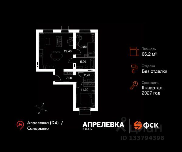 Прямая продажа от застройщика! Загородный жилой комплекс класса Комфорт Плюс. Продаётся 3-к квартира 98 общей площадью 66.2 кв.м на 4-м этаже 5 этажного дома. Без отделки. Расположение комплекса: "Апрелевка Клаб" это жилой комплекс всего в 30 км от Москвы по Киевскому шоссе, где городские удобства гармонично сочетаются с природой. Здесь начинается новая ступень жизни: современная малоэтажная застройка не нарушает живописные виды, а закрытая территория дарит чувство безопасности. Особенности проекта: - Улучшенная отделка МОПов - Социальная инфраструктура в шаговой доступности: муниципальные детский сад и школа, поликлиника - Не просто школа: школа МГИМО - Школа искусств МАРХИ - Всесезонное уникальное благоустройство: от города к природе через призму искусства - Комфортное пространство (спорт, досуг с детьми, работа в удаленном формате с прекрасными видами, место для творчества, тихие места для уединения и размышления) - Отличная транспортная доступность Транспортная доступность: - Метро Филатов Луг и Рассказовка 25 км - МЦД Апрелевка 5 км - МКАД — 30 км - Садовое кольцо — 45 км - Метро в Троицке (открытие в 2030) — 22 км - Ближайшая остановка общ. транспорта "Фрунзевец" 550 м - Ст. м. "Саларьево" 30 мин. на автобусе Внутренняя инфраструктура: Здесь есть хобби на любой вкус, возраст и сезон. Велосипедные, беговые и прогулочные маршруты, уличный workout, летний амфитеатр, спортивная площадка, центральная площадь с сухим фонтаном и игровыми зонами. Крытые развлечения: зона коворкинга, детская комната, кафе. В жилом комплексе будет современная школа на 830 мест и детский сад на 400 мест нового формата: с просторными классами и современным оснащением согласно высоким стандартам. Также на территории будет размещена школа искусств. Дворы без машин, игровые зоны и маршруты для прогулок с навигацией минимизируют риски и создают ощущение защищенности. Вдоль южной границы комплекса протекает река Десна, создавая зону отдыха в природном окружении. Продам 3-комнатную квартиру в новостройке без отделки в Апрелевке.