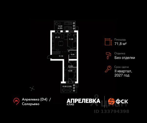 Прямая продажа от застройщика! Загородный жилой комплекс класса Комфорт Плюс. Продаётся 3-к квартира 168 общей площадью 71.8 кв.м на 1-м этаже 5 этажного дома. Без отделки. Расположение комплекса: "Апрелевка Клаб" это жилой комплекс всего в 30 км от Москвы по Киевскому шоссе, где городские удобства гармонично сочетаются с природой. Здесь начинается новая ступень жизни: современная малоэтажная застройка не нарушает живописные виды, а закрытая территория дарит чувство безопасности. Особенности проекта: - Улучшенная отделка МОПов - Социальная инфраструктура в шаговой доступности: муниципальные детский сад и школа, поликлиника - Не просто школа: школа МГИМО - Школа искусств МАРХИ - Всесезонное уникальное благоустройство: от города к природе через призму искусства - Комфортное пространство (спорт, досуг с детьми, работа в удаленном формате с прекрасными видами, место для творчества, тихие места для уединения и размышления) - Отличная транспортная доступность Транспортная доступность: - Метро Филатов Луг и Рассказовка 25 км - МЦД Апрелевка 5 км - МКАД — 30 км - Садовое кольцо — 45 км - Метро в Троицке (открытие в 2030) — 22 км - Ближайшая остановка общ. транспорта "Фрунзевец" 550 м - Ст. м. "Саларьево" 30 мин. на автобусе Внутренняя инфраструктура: Здесь есть хобби на любой вкус, возраст и сезон. Велосипедные, беговые и прогулочные маршруты, уличный workout, летний амфитеатр, спортивная площадка, центральная площадь с сухим фонтаном и игровыми зонами. Крытые развлечения: зона коворкинга, детская комната, кафе. В жилом комплексе будет современная школа на 830 мест и детский сад на 400 мест нового формата: с просторными классами и современным оснащением согласно высоким стандартам. Также на территории будет размещена школа искусств. Дворы без машин, игровые зоны и маршруты для прогулок с навигацией минимизируют риски и создают ощущение защищенности. Вдоль южной границы комплекса протекает река Десна, создавая зону отдыха в природном окружении.