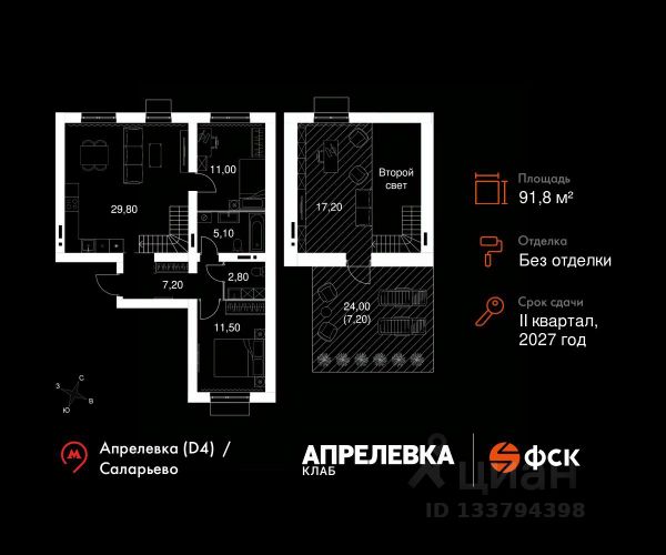 Прямая продажа от застройщика! Загородный жилой комплекс класса Комфорт Плюс. Продаётся 4-к квартира 102 общей площадью 91.8 кв.м на 5-м этаже 5 этажного дома. Без отделки. Расположение комплекса: "Апрелевка Клаб" это жилой комплекс всего в 30 км от Москвы по Киевскому шоссе, где городские удобства гармонично сочетаются с природой. Здесь начинается новая ступень жизни: современная малоэтажная застройка не нарушает живописные виды, а закрытая территория дарит чувство безопасности. Особенности проекта: - Улучшенная отделка МОПов - Социальная инфраструктура в шаговой доступности: муниципальные детский сад и школа, поликлиника - Не просто школа: школа МГИМО - Школа искусств МАРХИ - Всесезонное уникальное благоустройство: от города к природе через призму искусства - Комфортное пространство (спорт, досуг с детьми, работа в удаленном формате с прекрасными видами, место для творчества, тихие места для уединения и размышления) - Отличная транспортная доступность Транспортная доступность: - Метро Филатов Луг и Рассказовка 25 км - МЦД Апрелевка 5 км - МКАД — 30 км - Садовое кольцо — 45 км - Метро в Троицке (открытие в 2030) — 22 км - Ближайшая остановка общ. транспорта "Фрунзевец" 550 м - Ст. м. "Саларьево" 30 мин. на автобусе Внутренняя инфраструктура: Здесь есть хобби на любой вкус, возраст и сезон. Велосипедные, беговые и прогулочные маршруты, уличный workout, летний амфитеатр, спортивная площадка, центральная площадь с сухим фонтаном и игровыми зонами. Крытые развлечения: зона коворкинга, детская комната, кафе. В жилом комплексе будет современная школа на 830 мест и детский сад на 400 мест нового формата: с просторными классами и современным оснащением согласно высоким стандартам. Также на территории будет размещена школа искусств. Дворы без машин, игровые зоны и маршруты для прогулок с навигацией минимизируют риски и создают ощущение защищенности. Вдоль южной границы комплекса протекает река Десна, создавая зону отдыха в природном окружении. Продается 4-комнатная квартира от застройщика в Апрелевке.