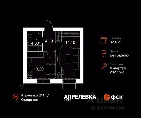 Прямая продажа от застройщика! Загородный жилой комплекс класса Комфорт Плюс. Продаётся 1-к квартира 67 общей площадью 33.6 кв.м на 2-м этаже 5 этажного дома. Без отделки. Расположение комплекса: "Апрелевка Клаб" это жилой комплекс всего в 30 км от Москвы по Киевскому шоссе, где городские удобства гармонично сочетаются с природой. Здесь начинается новая ступень жизни: современная малоэтажная застройка не нарушает живописные виды, а закрытая территория дарит чувство безопасности. Особенности проекта: - Улучшенная отделка МОПов - Социальная инфраструктура в шаговой доступности: муниципальные детский сад и школа, поликлиника - Не просто школа: школа МГИМО - Школа искусств МАРХИ - Всесезонное уникальное благоустройство: от города к природе через призму искусства - Комфортное пространство (спорт, досуг с детьми, работа в удаленном формате с прекрасными видами, место для творчества, тихие места для уединения и размышления) - Отличная транспортная доступность Транспортная доступность: - Метро Филатов Луг и Рассказовка 25 км - МЦД Апрелевка 5 км - МКАД — 30 км - Садовое кольцо — 45 км - Метро в Троицке (открытие в 2030) — 22 км - Ближайшая остановка общ. транспорта "Фрунзевец" 550 м - Ст. м. "Саларьево" 30 мин. на автобусе Внутренняя инфраструктура: Здесь есть хобби на любой вкус, возраст и сезон. Велосипедные, беговые и прогулочные маршруты, уличный workout, летний амфитеатр, спортивная площадка, центральная площадь с сухим фонтаном и игровыми зонами. Крытые развлечения: зона коворкинга, детская комната, кафе. В жилом комплексе будет современная школа на 830 мест и детский сад на 400 мест нового формата: с просторными классами и современным оснащением согласно высоким стандартам. Также на территории будет размещена школа искусств. Дворы без машин, игровые зоны и маршруты для прогулок с навигацией минимизируют риски и создают ощущение защищенности. Вдоль южной границы комплекса протекает река Десна, создавая зону отдыха в природном окружении. Продам квартиру до 10 млн. рублей в Апрелевке.