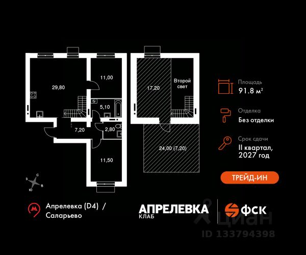 Прямая продажа от застройщика! Загородный жилой комплекс класса Комфорт Плюс. Продаётся 2-к квартира номер 102 общей площадью 91.8 кв.м на 5-м этаже 5 этажного дома. Без отделки. Особенности: - Квартира доступна к покупке в Trade-In. - Распашная планировка - отличное сочетание удобства и свободы. - Увеличенное число окон - Душ помимо ванной - дополнительное удобство для вашей семьи. - Евроформат - просторное и удобное жилье с отличной планировкой. - Гибкая планировка - создайте пространство по своему вкусу. - Двухуровневая квартира - пространство и стиль в одном. - Просторная мягкая зона - комфорт и уют для отдыха всей семьи. - Ниша под шкаф - компактное и удобное место для вещей. - Терраса - место для загара и вечерних посиделок. - Вид из окна: двор - Вид из окна на шоссе Квартира без отделки. Чистый холст для воплощения интерьера вашей мечты. Расположение комплекса: "Апрелевка Клаб" - это жилой комплекс всего в 30 км от Москвы по Киевскому шоссе, где городские удобства гармонично сочетаются с природой. Здесь начинается новая ступень жизни: современная малоэтажная застройка не нарушает живописные виды, а закрытая территория дарит чувство безопасности. Транспортная доступность: - Метро Филатов Луг и Рассказовка - 25 км - МЦД Апрелевка - 5 км - МКАД — 30 км - Садовое кольцо — 45 км - Метро в Троицке (открытие в 2030) — 22 км - Ближайшая остановка общ. транспорта "Фрунзевец" - 550 м - Ст. м. "Саларьево" - 30 мин. на автобусе Внутренняя инфраструктура: Здесь есть хобби на любой вкус, возраст и сезон. Велосипедные, беговые и прогулочные маршруты, уличный workout, летний амфитеатр, спортивная площадка, центральная площадь с сухим фонтаном и игровыми зонами. Крытые развлечения: зона коворкинга, детская комната, кафе. В жилом комплексе будет современная школа на 830 мест и детский сад на 400 мест нового формата: с просторными классами и современным оснащением согласно высоким стандартам. Также на территории будет размещена школа искусств. Дворы без машин, игровые зоны и маршруты для прогулок с навигацией минимизируют риски и создают ощущение защищенности. Вдоль южной границы комплекса протекает река Десна, создавая зону отдыха в природном окружении. Цены указаны с учетом скидки. Квартира, примерная площадь 90 м2 в Апрелевке.