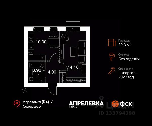 Прямая продажа от застройщика! Загородный жилой комплекс класса Комфорт Плюс. Продаётся 1-к квартира 103 общей площадью 28.1 кв.м на 5-м этаже 5 этажного дома. Без отделки. Расположение комплекса: "Апрелевка Клаб" это жилой комплекс всего в 30 км от Москвы по Киевскому шоссе, где городские удобства гармонично сочетаются с природой. Здесь начинается новая ступень жизни: современная малоэтажная застройка не нарушает живописные виды, а закрытая территория дарит чувство безопасности. Особенности проекта: - Улучшенная отделка МОПов - Социальная инфраструктура в шаговой доступности: муниципальные детский сад и школа, поликлиника - Не просто школа: школа МГИМО - Школа искусств МАРХИ - Всесезонное уникальное благоустройство: от города к природе через призму искусства - Комфортное пространство (спорт, досуг с детьми, работа в удаленном формате с прекрасными видами, место для творчества, тихие места для уединения и размышления) - Отличная транспортная доступность Транспортная доступность: - Метро Филатов Луг и Рассказовка 25 км - МЦД Апрелевка 5 км - МКАД — 30 км - Садовое кольцо — 45 км - Метро в Троицке (открытие в 2030) — 22 км - Ближайшая остановка общ. транспорта "Фрунзевец" 550 м - Ст. м. "Саларьево" 30 мин. на автобусе Внутренняя инфраструктура: Здесь есть хобби на любой вкус, возраст и сезон. Велосипедные, беговые и прогулочные маршруты, уличный workout, летний амфитеатр, спортивная площадка, центральная площадь с сухим фонтаном и игровыми зонами. Крытые развлечения: зона коворкинга, детская комната, кафе. В жилом комплексе будет современная школа на 830 мест и детский сад на 400 мест нового формата: с просторными классами и современным оснащением согласно высоким стандартам. Также на территории будет размещена школа искусств. Дворы без машин, игровые зоны и маршруты для прогулок с навигацией минимизируют риски и создают ощущение защищенности. Вдоль южной границы комплекса протекает река Десна, создавая зону отдыха в природном окружении. Квартира в ипотеку в новостройке от застройщиков в Апрелевке.