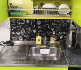 Вся необходимая бытовая техника: холодильник, микроволновка, чайник, плита;