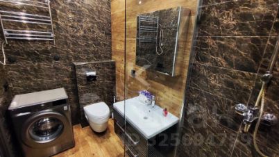 в ванной комнате стиральная машинка и большая душевая кабина с тропическим душем