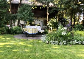 Чудесный сад с лесными деревьями утопает в цветах. Газон.