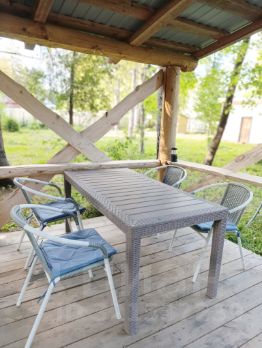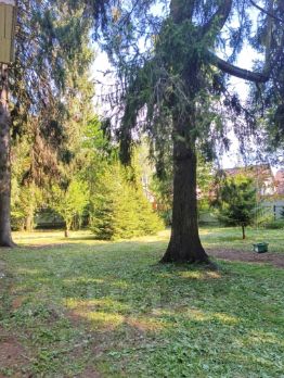 На участке свой собственный лес и неповторимое уединение. При этом недалеко от городской инфраструктуры г. Апрелевка. Есть беседка со светом, мангальная зона, песочница, детские качели. В доме стоит спальня с двуспальной кроватью и два раскладных дивана, есть детская кроватка, проектор, проводной Интернет с Wi-Fi.