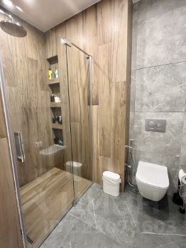 Тёплый пол по всему первому этажу, сделана водоподготовка, установлена премиум сантехника Hansgrohe, GEBERIT. Мебель на заказ, окрашенная эмалью.