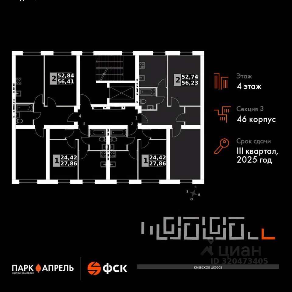 Продаётся 2-к квартира номер 52 в сданном корпусе общей площадью 56.23 кв.м на 4-м этаже 4 этажного дома.