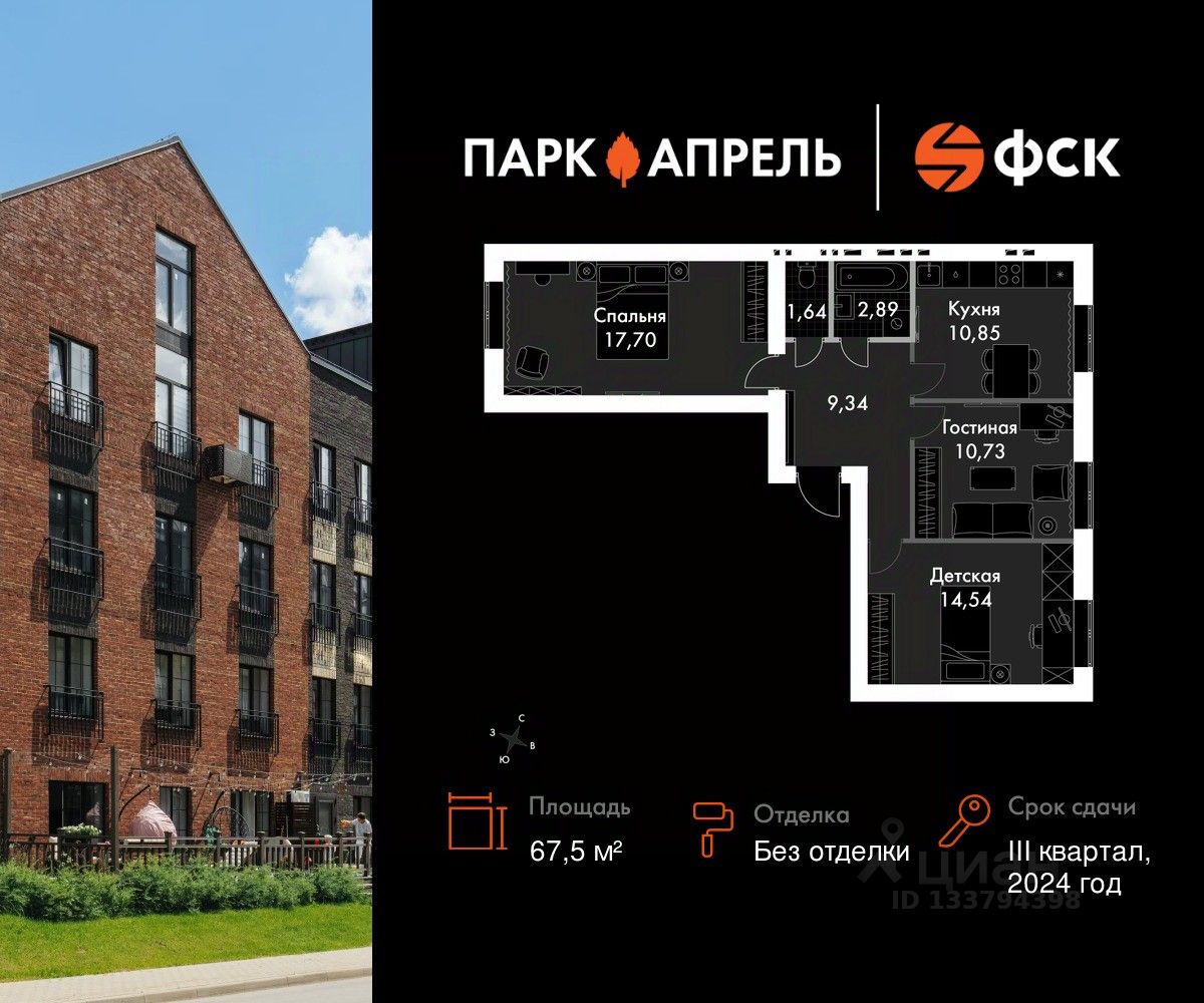 Продаётся 3-к квартира 132 в сданном корпусе общей площадью 67.5 кв.м на 4-м этаже 4 этажного дома. Без отделки.