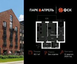 Продаётся 1-к квартира 4 в сданном корпусе общей площадью 60.10 кв.м на 1-м этаже 4 этажного дома. Без отделки.