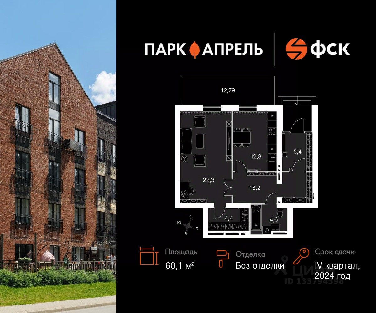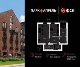 Продаётся 1-к квартира 4 в сданном корпусе общей площадью 60.1 кв.м на 1-м этаже 4 этажного дома. Без отделки.