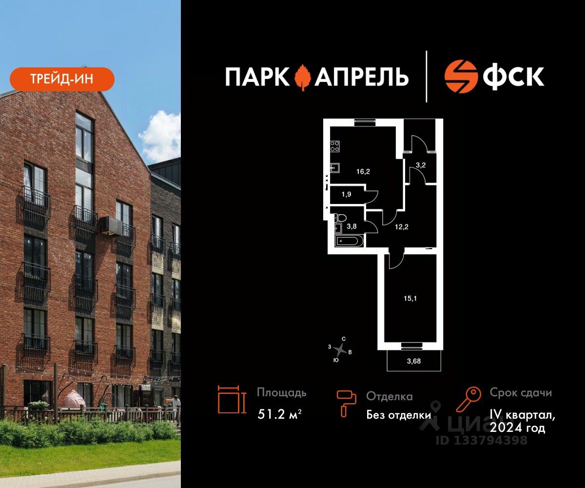 Продаётся 1-к квартира номер 12 в сданном корпусе общей площадью 51.2 кв.м на 1-м этаже 4 этажного дома.
