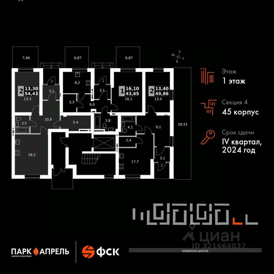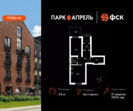 Продаётся 1-к квартира номер 2 в сданном корпусе общей площадью 54 кв.м на 1-м этаже 4 этажного дома.