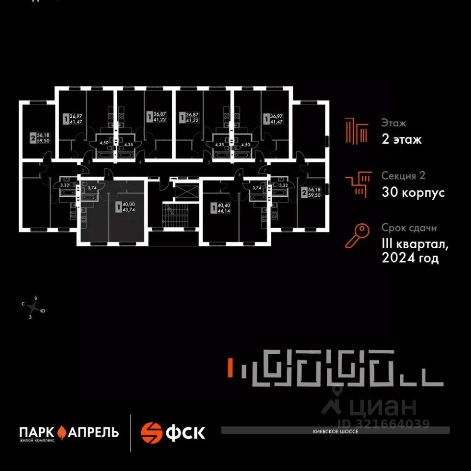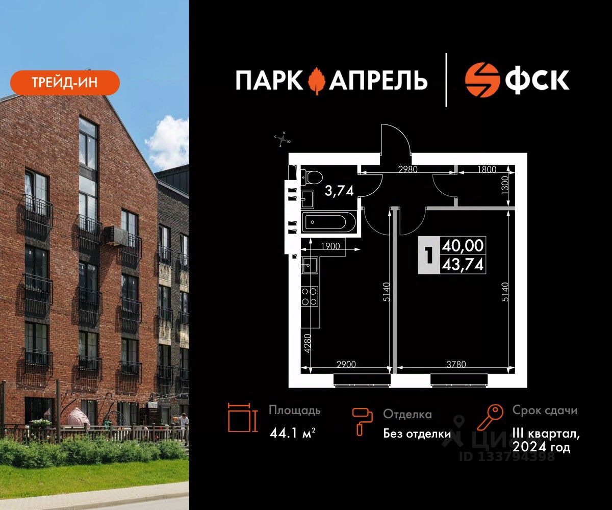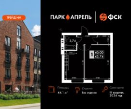 Продаётся 1-к квартира номер 9 в сданном корпусе общей площадью 44.1 кв.м на 2-м этаже 4 этажного дома.