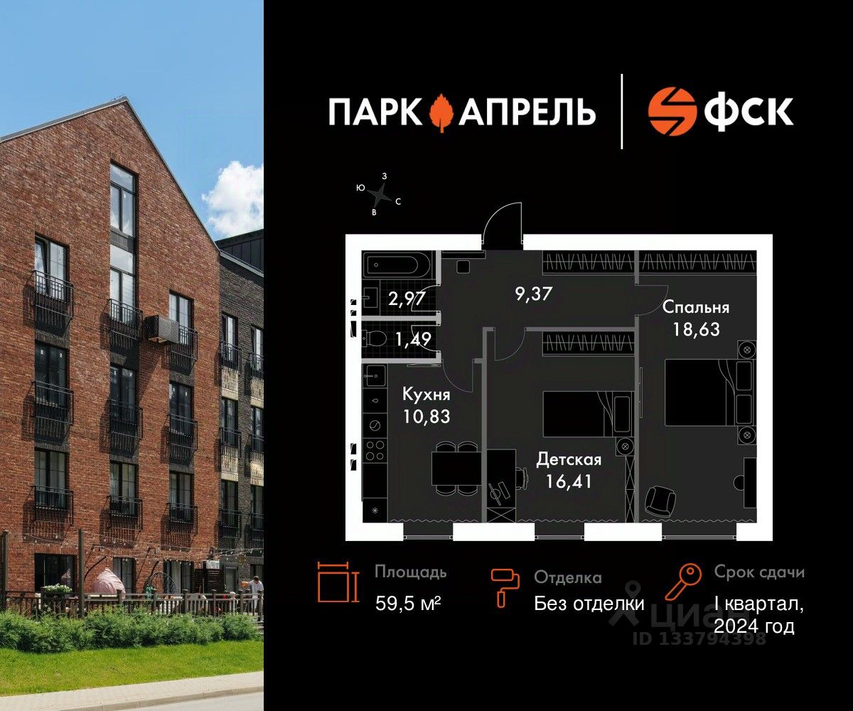 Продаётся 2-к квартира 26 в сданном корпусе общей площадью 59.5 кв.м на 3-м этаже 4 этажного дома. Без отделки.