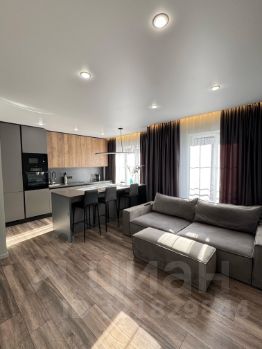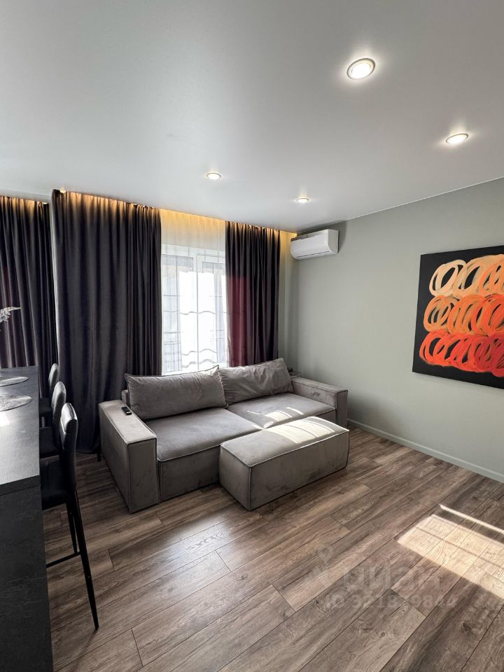 Просторная светлая кухня-гостиная с качественной отделкой и продуманной функциональностью. В комнате расположен кондиционер.