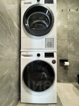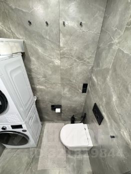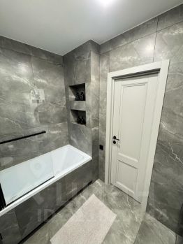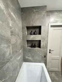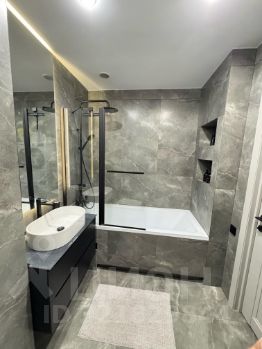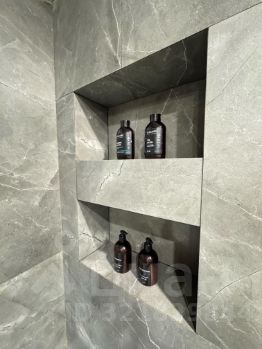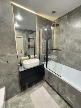 Просторная ванная комната с тёплыми полами и стеной, установлено панорамное зеркало с подсветкой, тропический душ, инсталляция с подвесным унитазом, встроенные полки под ванные принадлежности и многое другое.