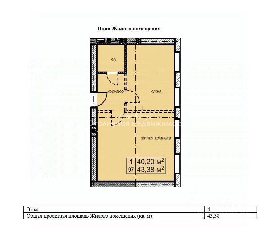 Общая площадь 43.4 кв. м, в квартире четыре больших окна и много света.