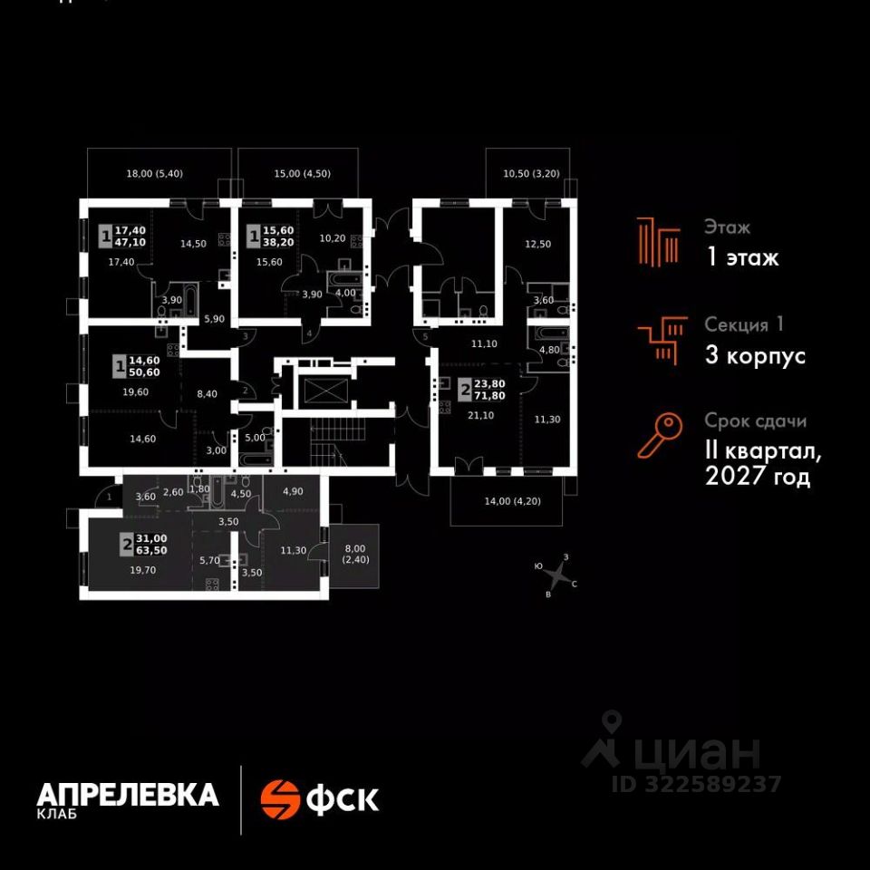 Продаётся 2-к квартира номер 1 общей площадью 63.5 кв.м на 1-м этаже 5 этажного дома. Без отделки.