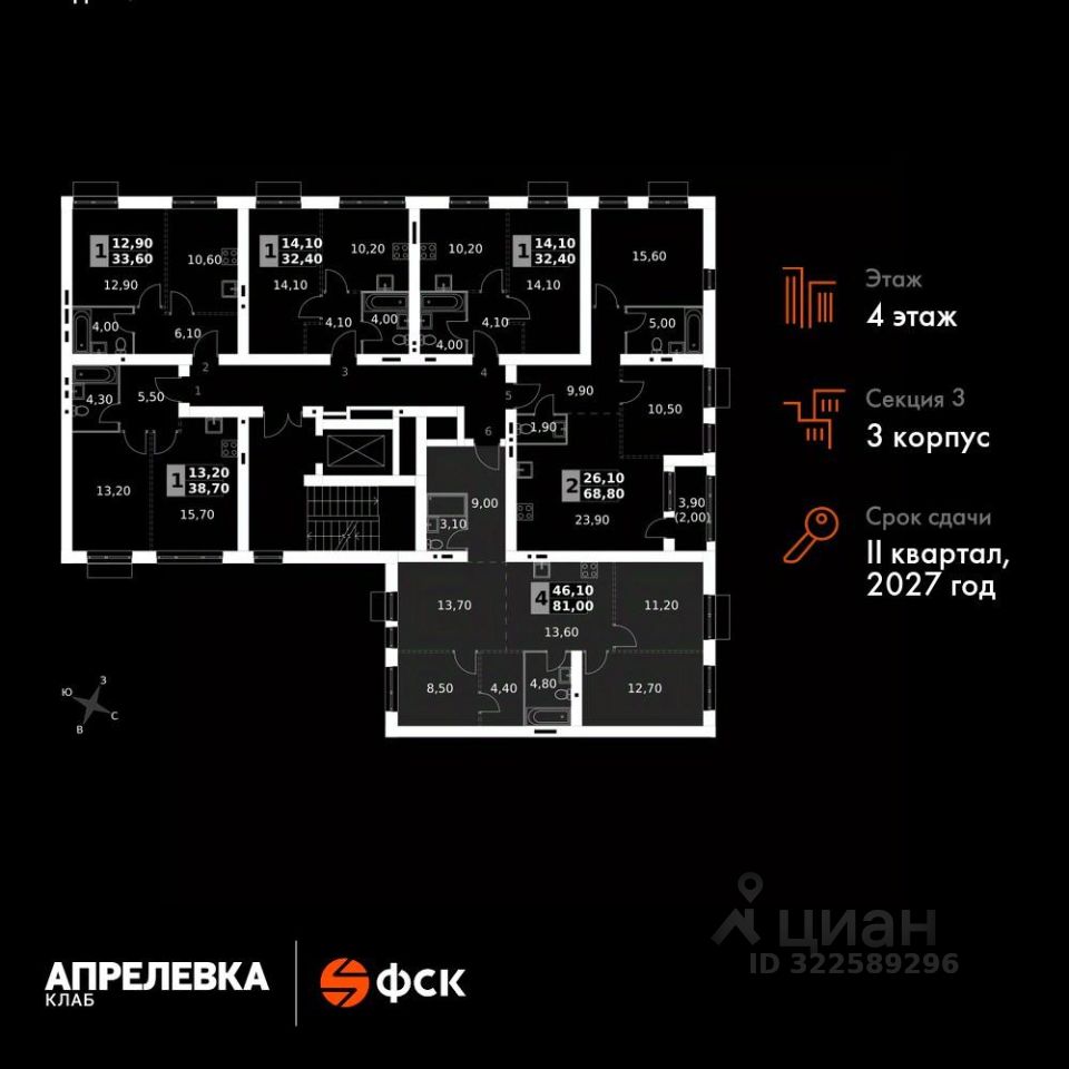Продаётся 4-к квартира номер 83 общей площадью 81 кв.м на 4-м этаже 5 этажного дома. Без отделки.