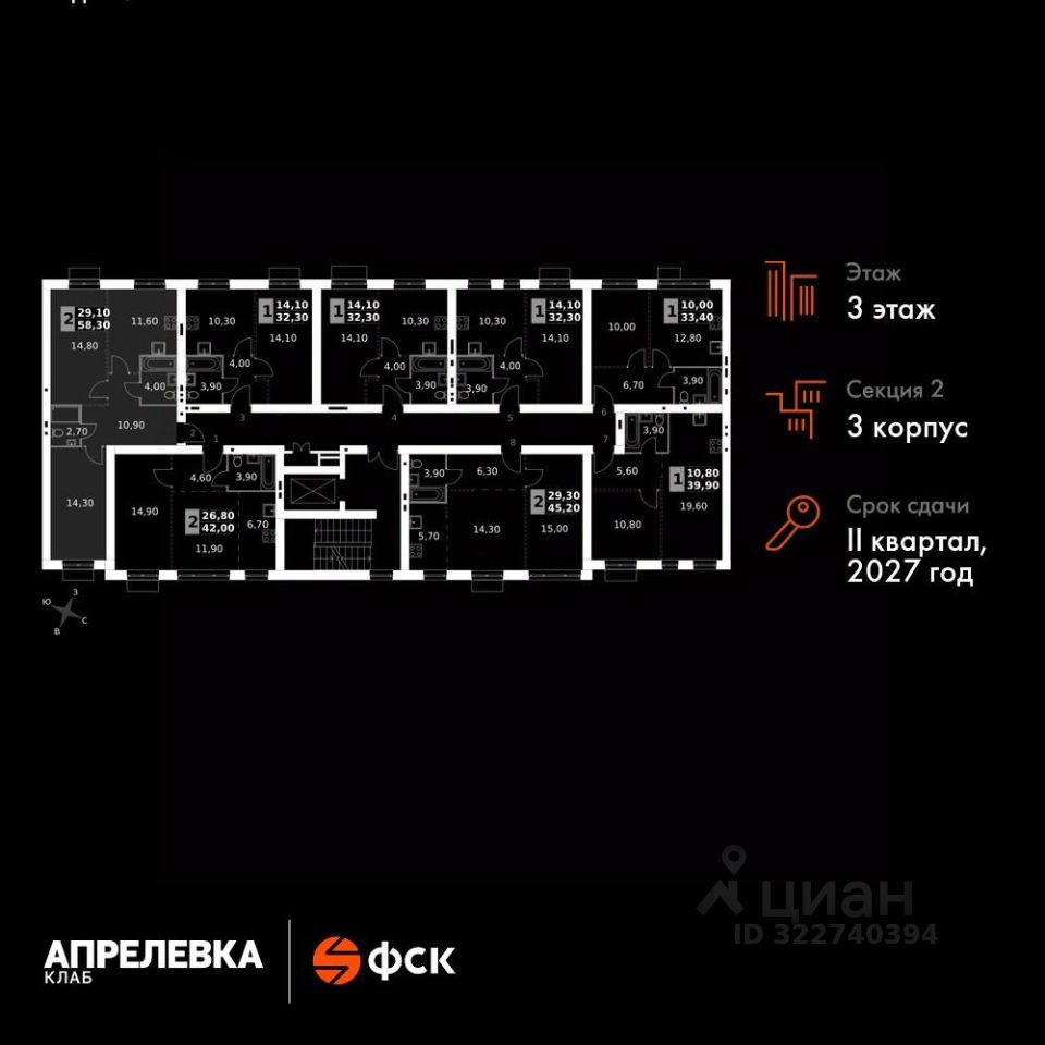 Продаётся 2-к квартира номер 43 общей площадью 58.3 кв.м на 3-м этаже 5 этажного дома. Без отделки.