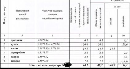 Общая площадь - 48,2 кв. м. жилая площадь - 14,1 кв. м, площадь кухни - 20, 6 кв. м.