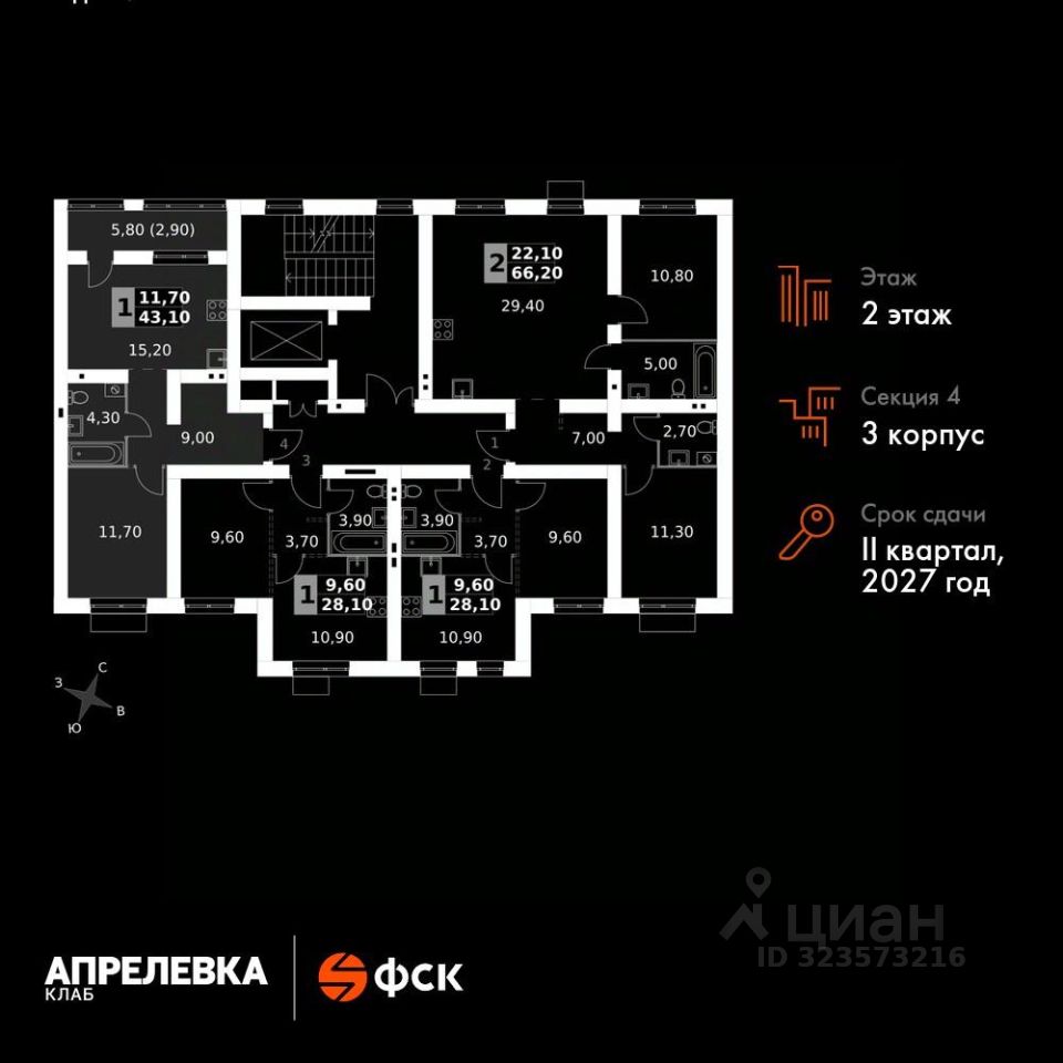 Продаётся 2-к квартира номер 93 общей площадью 43.1 кв.м на 2-м этаже 5 этажного дома. Без отделки.