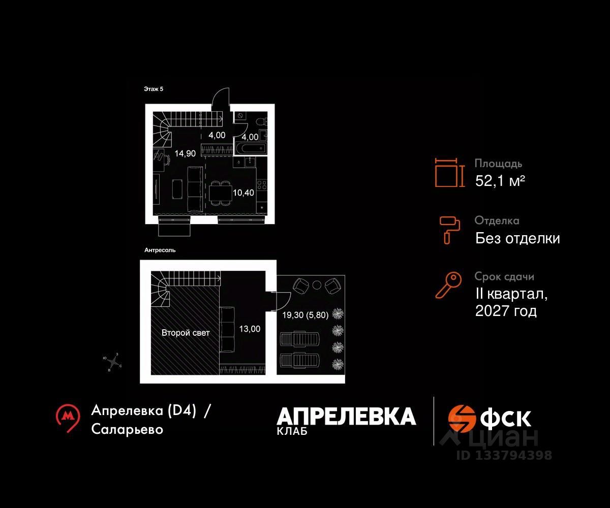 Продаётся 2-к квартира 129 общей площадью 52.1 кв.м на 5-м этаже 5 этажного дома. Без отделки.