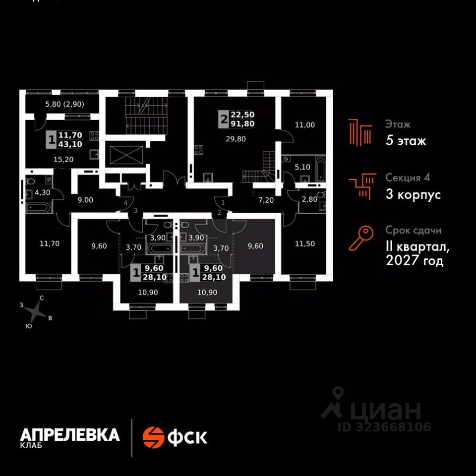 Продаётся 1-к квартира номер 103 общей площадью 28.1 кв.м на 5-м этаже 5 этажного дома. Без отделки.