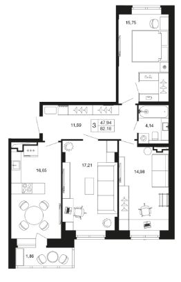 3-комн. квартира в ЖК комфорт-класса "Времена года" на 8 этаже в 9 этажном корпусе 12. Общая площадь: 82.18 кв.м., жилая: 47.94 кв.м. Высота потолков 2.76 м. "Времена года" современный жилой комплекс комфорт-класса, расположенный в тихом и зеленом подмосковном городе Апрелевка, в 1 минуте пешком от станции МЦД-4 "Победа".