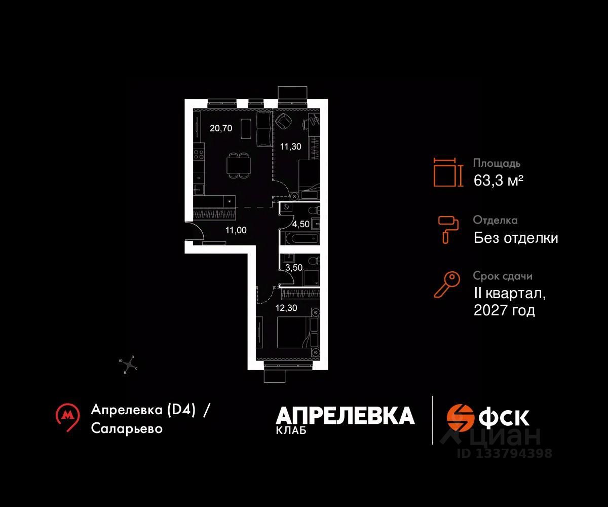 Продаётся 3-к квартира 173 общей площадью 63.3 кв.м на 2-м этаже 5 этажного дома. Без отделки.
