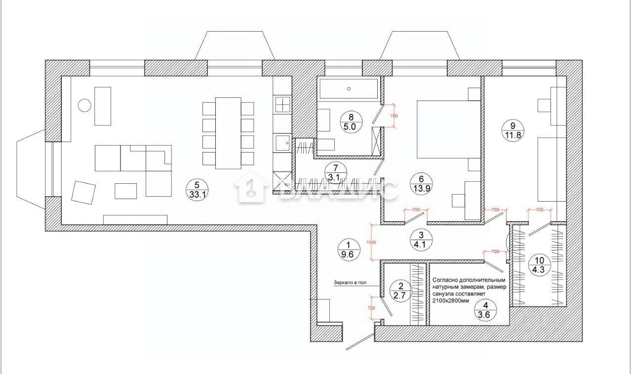 Общая площадь квартиры — 91,3 кв. м, из которых 56,7 кв. м — жилая площадь. Квартира включает две раздельные спальни и просторную гостиную, а также два раздельных санузла. Высокие потолки (2,9 м) создают ощущение простора и свободы.
