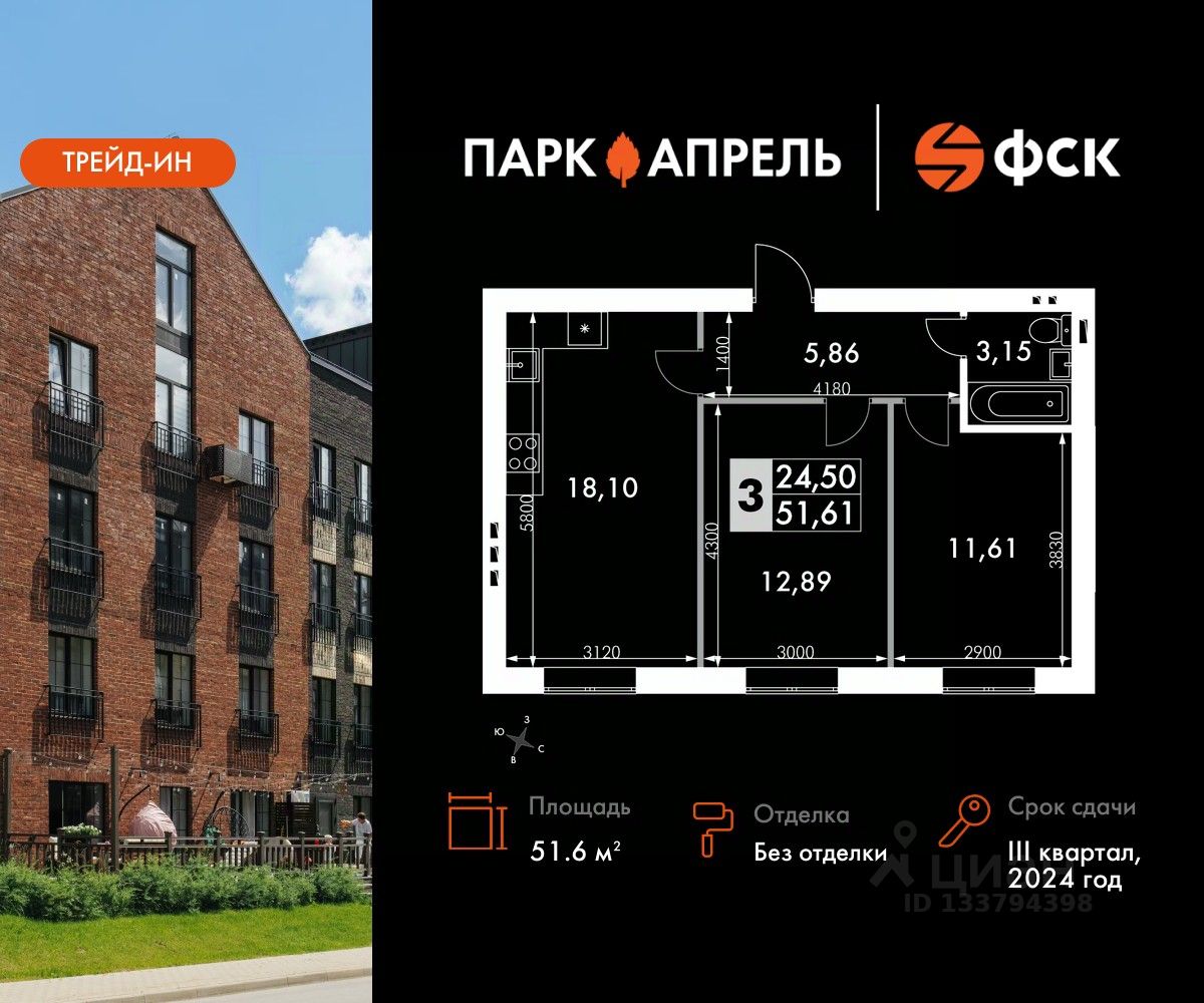 Продаётся 2-к квартира номер 154 в сданном корпусе общей площадью 51.6 кв.м на 4-м этаже 4 этажного дома. Sky Loft.