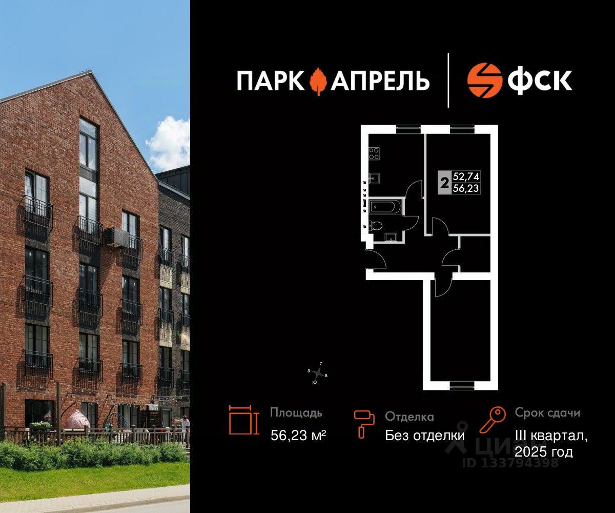 Продаётся 2-к квартира 52 в сданном корпусе общей площадью 56.23 кв.м на 4-м этаже 4 этажного дома. Без отделки.