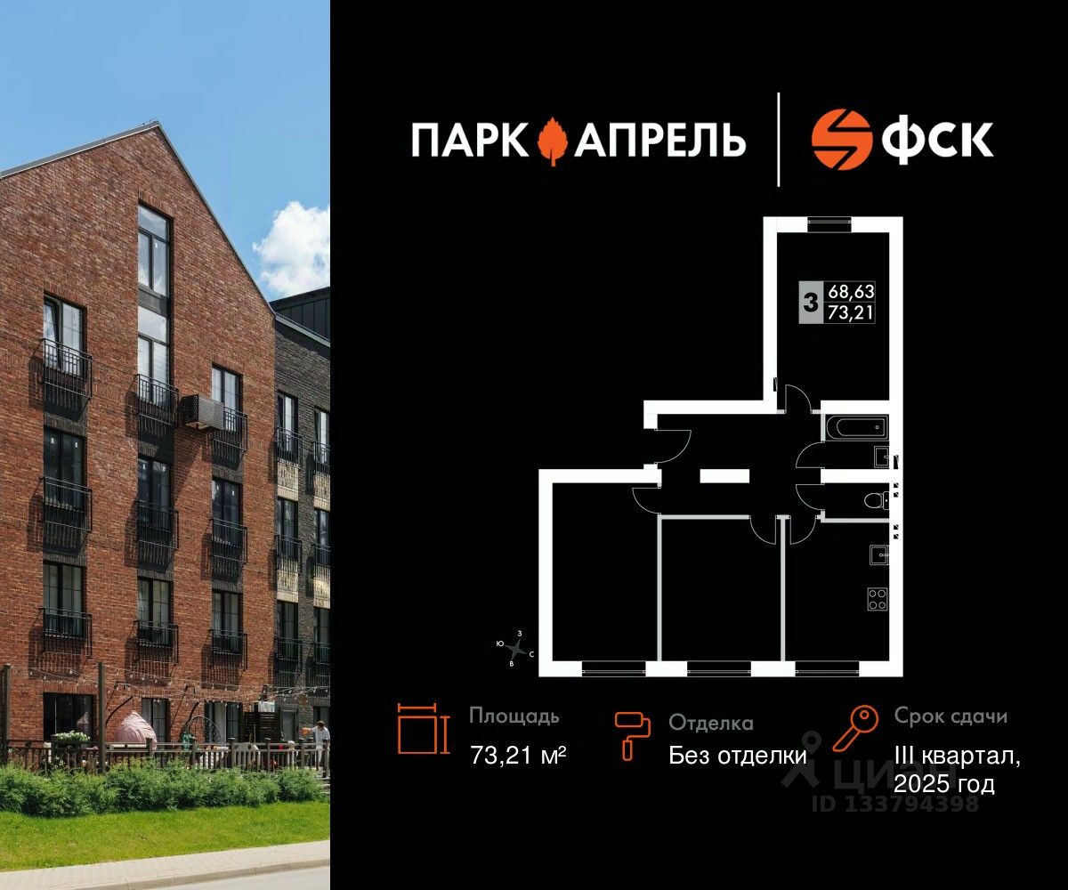 Продаётся 3-к квартира 67 в сданном корпусе общей площадью 73.21 кв.м на 3-м этаже 4 этажного дома. Без отделки.