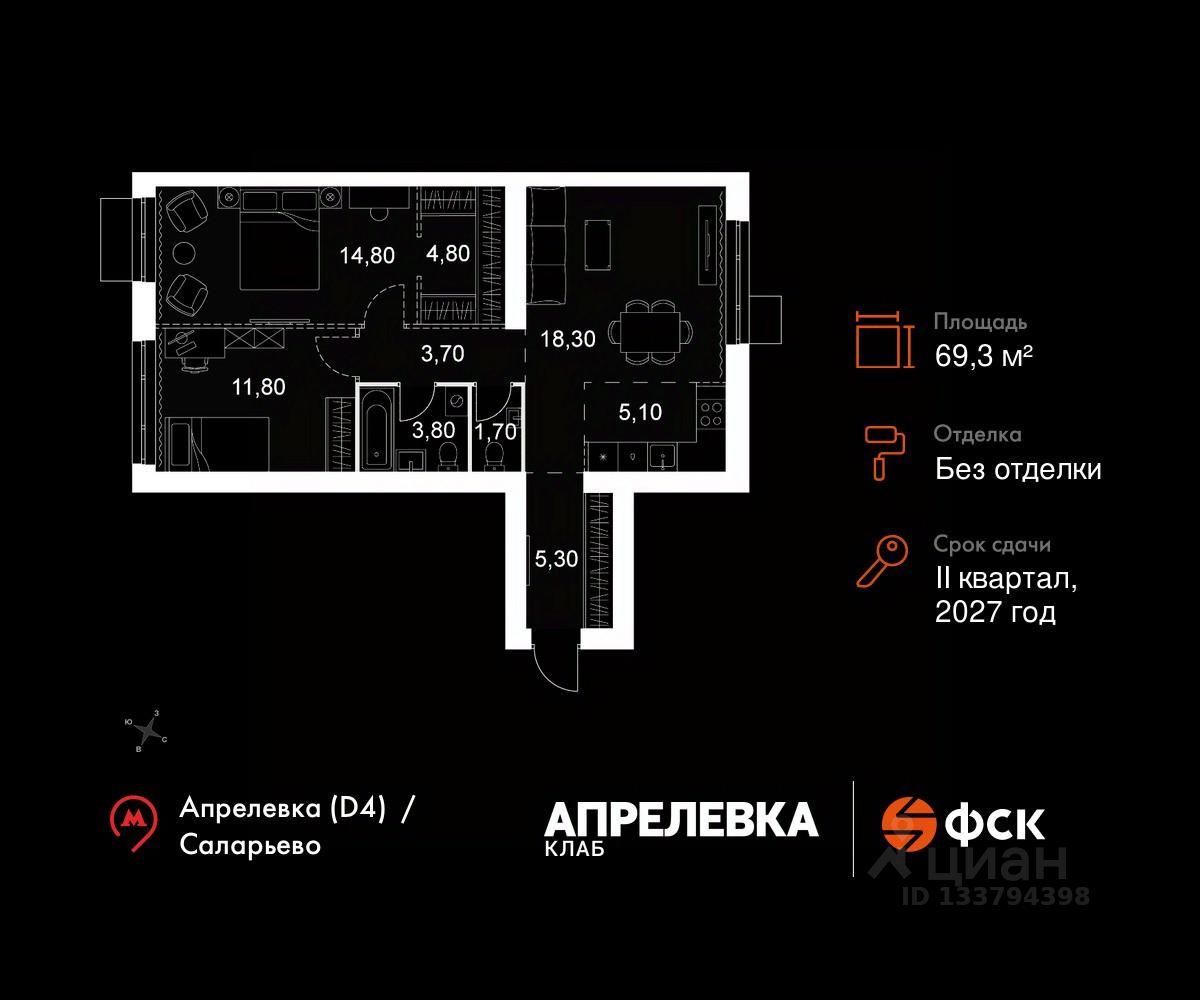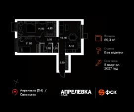 Продаётся 3-к квартира 178 общей площадью 69.3 кв.м на 2-м этаже 5 этажного дома. Без отделки.