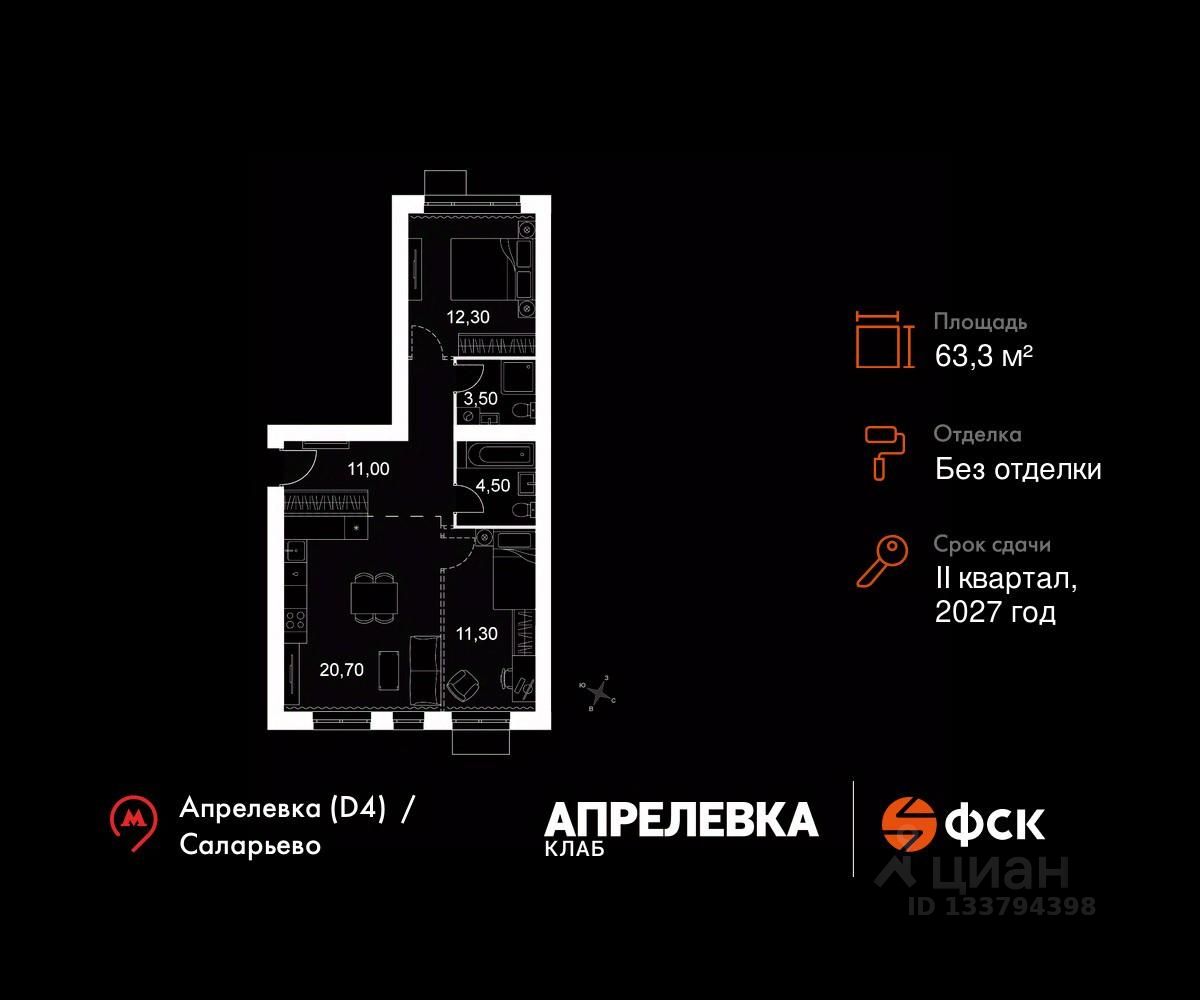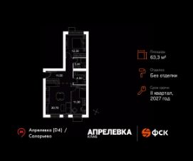 Продаётся 3-к квартира 11 общей площадью 63.3 кв.м на 2-м этаже 5 этажного дома. Без отделки.
