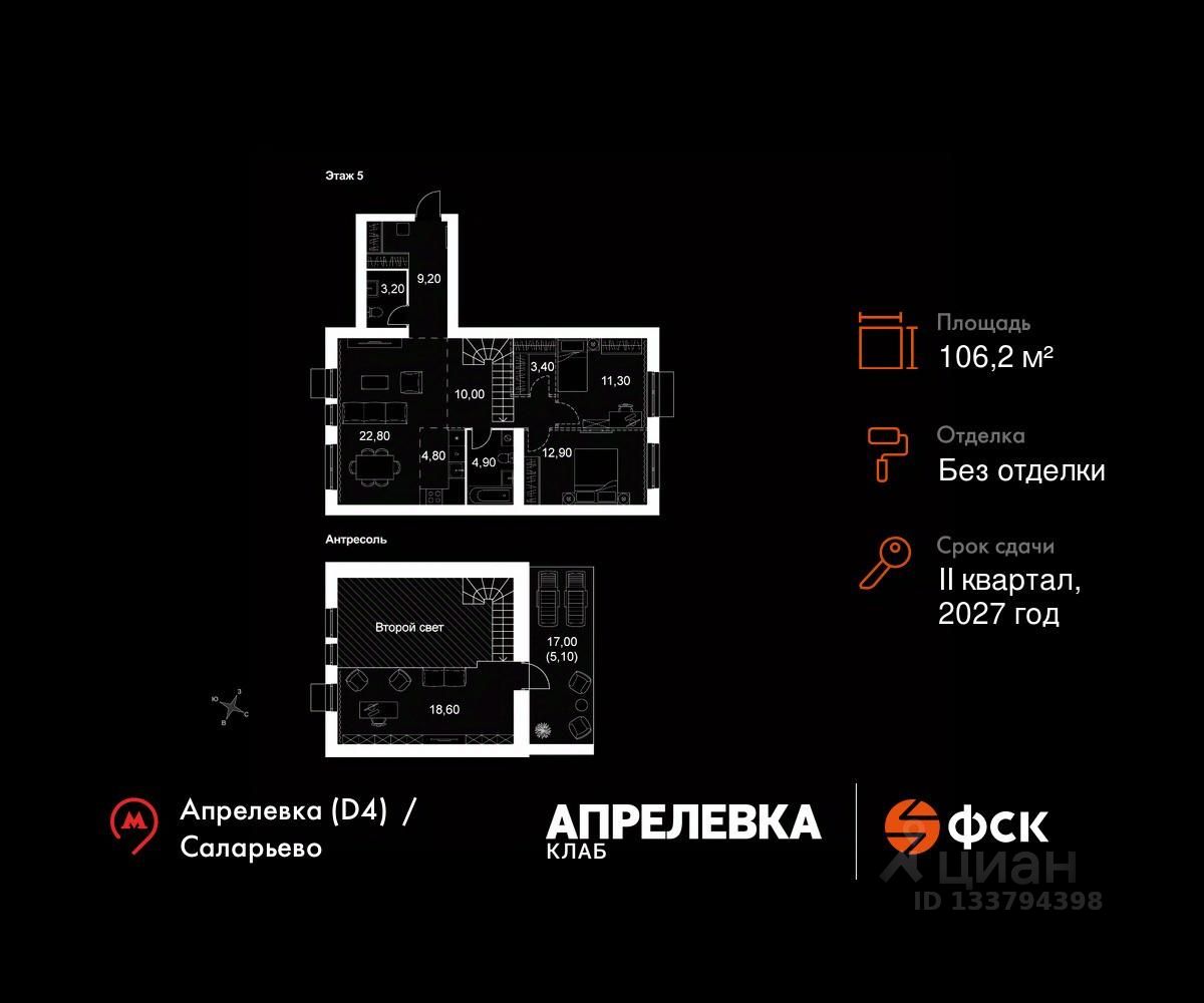 Продаётся 5-к квартира 90 общей площадью 106.2 кв.м на 5-м этаже 5 этажного дома. Без отделки.