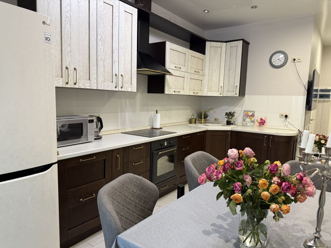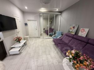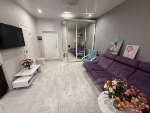 В квартире выполнен качественный евроремонт. Просторная кухня оснащена всей необходимой техникой и мебелью, включая посудомоечную машину.