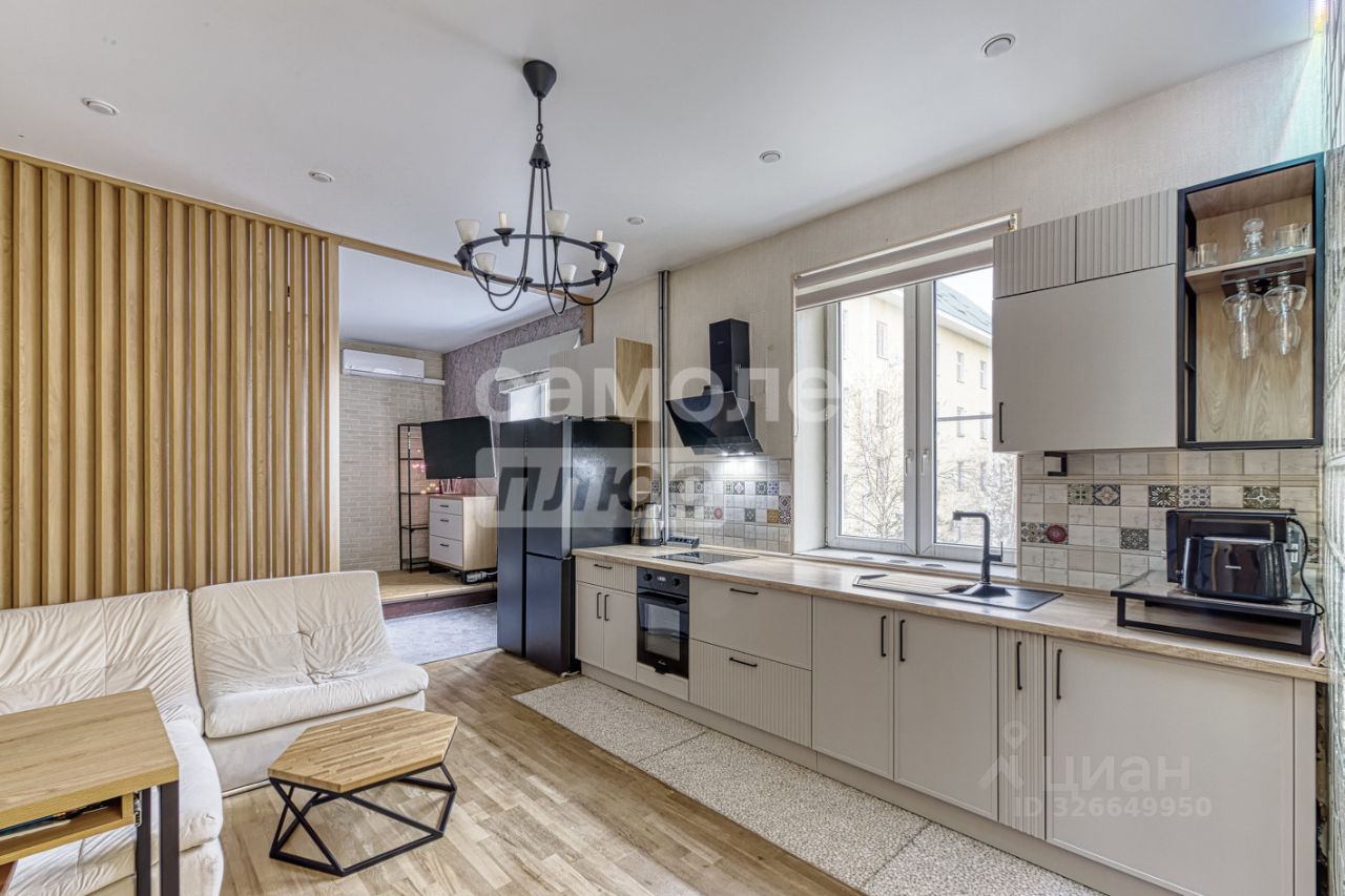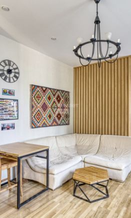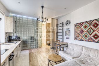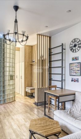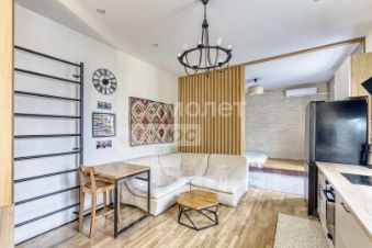 Предлагается к продаже не просто квартира, а готовая к проживанию работа дизайнера. В отделке использованы дерево, камень и другие натуральные материалы. Большая комната грамотно разделена деревянной перегородкой на две функциональные зоны, что создает ощущение просторной студии с приватной спальной территорией.