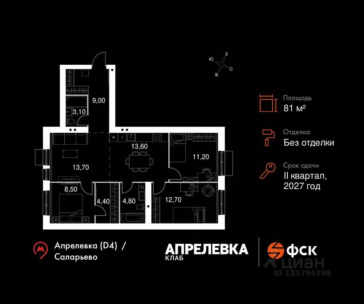 Продаётся 4-к квартира 71 общей площадью 81 кв.м на 2-м этаже 5 этажного дома. Без отделки.