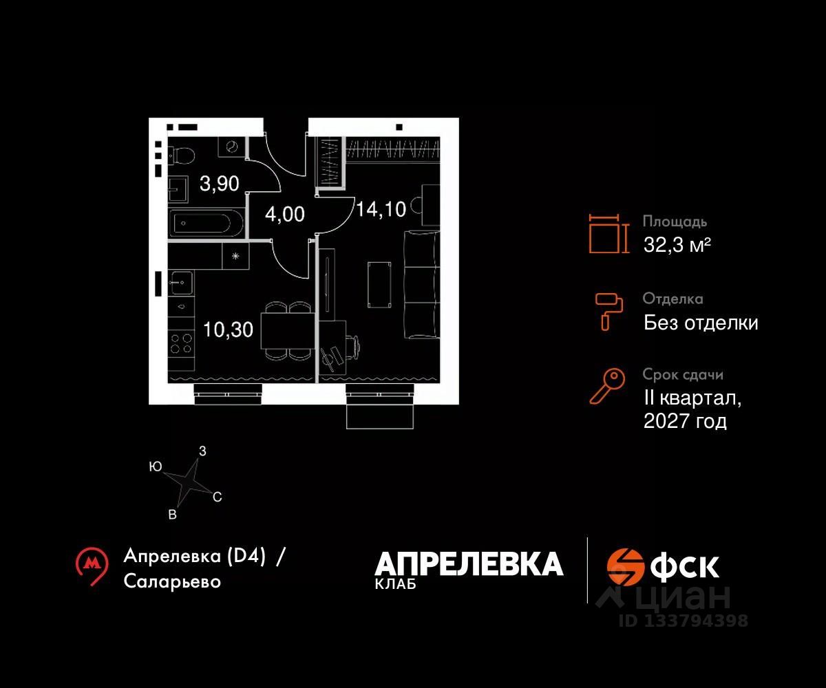 Продаётся 1-к квартира 155 общей площадью 32.3 кв.м на 4-м этаже 5 этажного дома. Без отделки.