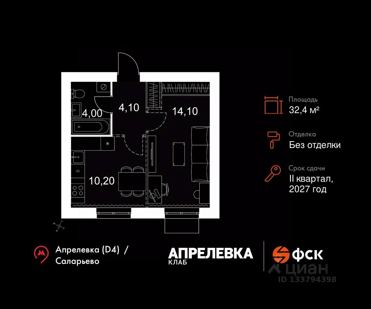 Продаётся 1-к квартира 122 общей площадью 32.4 кв.м на 4-м этаже 5 этажного дома. Без отделки.