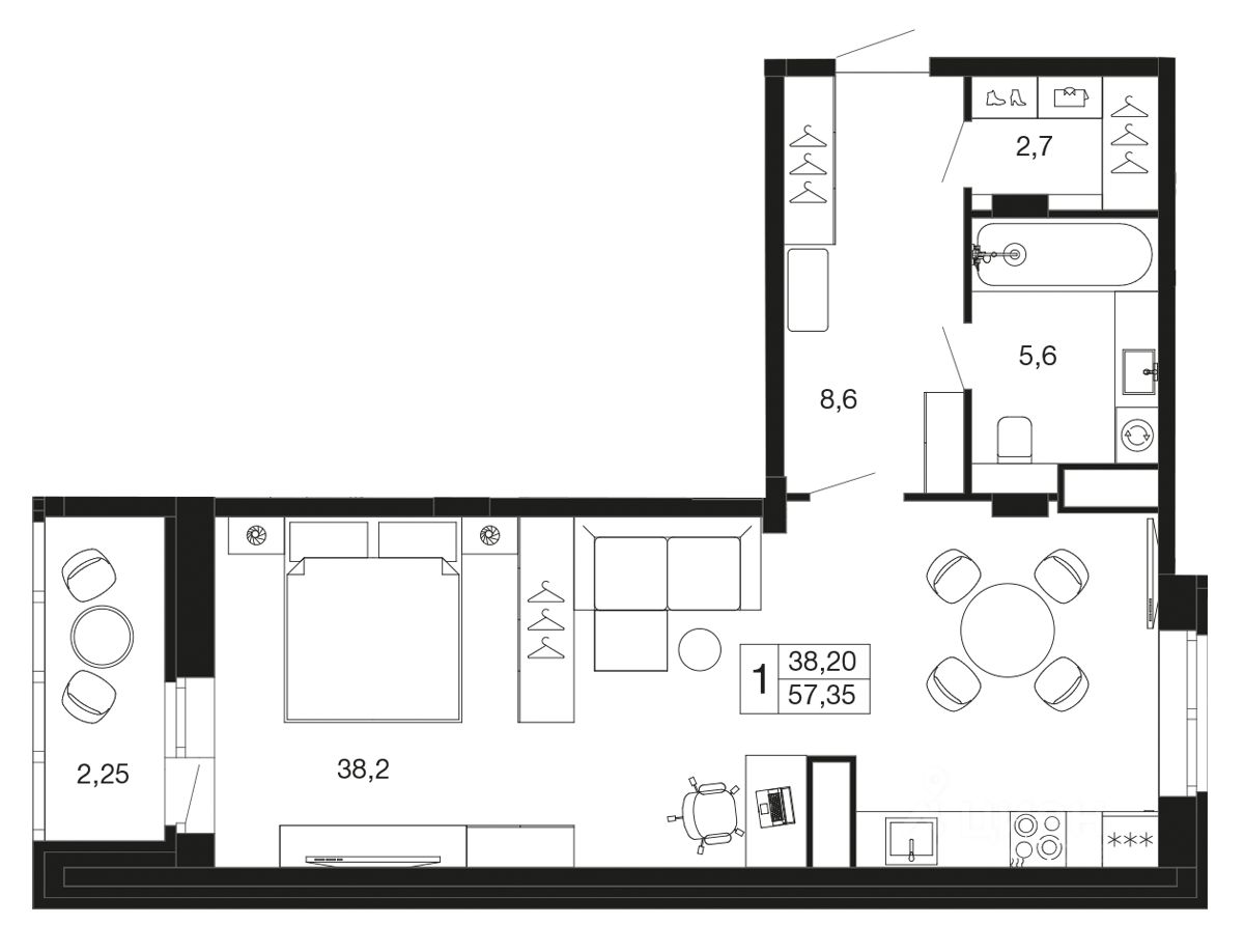 квартира-студия в ЖК комфорт-класса "Времена года" на 9 этаже в 9 этажном корпусе 2. Общая площадь: 57.5 кв.м., жилая: 25.74 кв.м. Высота потолков 2.76 м. "Времена года" современный жилой комплекс комфорт-класса, расположенный в тихом и зеленом подмосковном городе Апрелевка, в 1 минуте пешком от станции МЦД-4 "Победа".