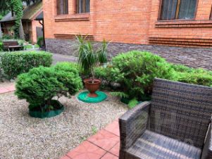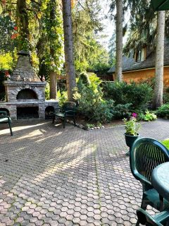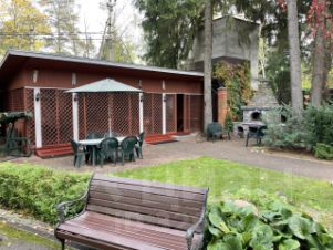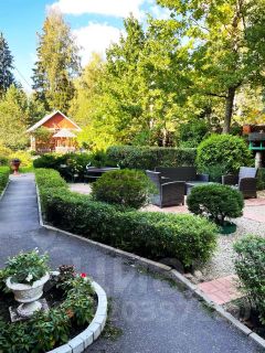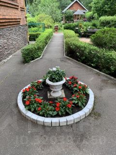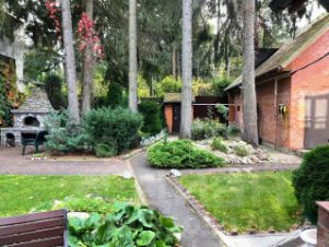 Участок, 23,5 соток, разбивается на несколько функциональных зон. Лесная зона на даль-нем краю участка с естественными ландшафтом, где можно собирать грибы, отделена от остального участка легкой оградой. Это настоящий лес. Есть зона сада с плодовыми деревьями и теплицей для помидоров. Рекреационная зона включает в себя отдельно стоящее здание русской бани на дровах, крытую площадку для настольного тенниса, место для барбекю и большую крытую и меблированную веранду для отдыха на открытом воздухе. Здесь также высажены голубые ели и организован пруд с водопадом. Хозяйственная зона кирпичный гараж на две машины и квартира для обслуживающего персонала 54 кв.м. Есть замощенная площадка для парковки гостевых автомобилей. Участок обнесён высокой оградой и по краям растут высокие деревья. Это даёт приватность и безопасность проживания.