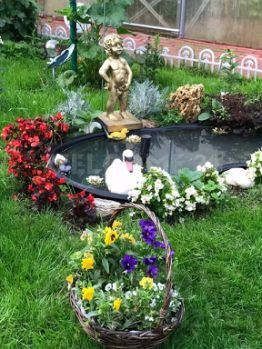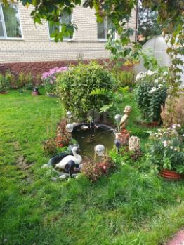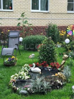 • Небольшой прудик с фонтанчиком и садовые качели.